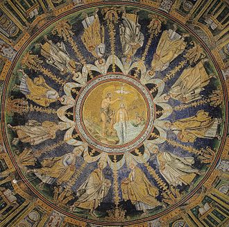 English : The ceiling mosaic in the Baptistry of Neon in Ravenna, Italy depicts the Baptism of Jesus. Built around 6th century A.D., the building is a UNESCO World heritage site. Today is the Feast of the Baptism of the Lord in much of Western Christianity.