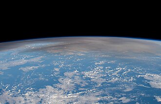 English : The atmospheric plume from an underwater volcano eruption in the Pacific nation of Tonga is pictured from the International Space Station as it orbited 269 miles above the Pacific Ocean northwest of Auckland, New Zealand.