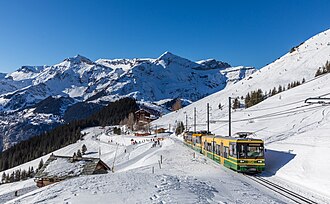 ![]() WAB Bhe 4/8 149 EMU with control car BDt 254 headed down from Kleine Scheidegg to Wengernalp, Switzerland. Change image |